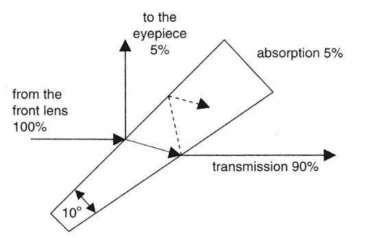 巴德膜/太阳膜因为难以避免的表面不平整和膜的散射而会影响分辨率,使用目镜端减光则可以避免这种问题。赫歇尔棱镜是由天王星的发现者,大名鼎鼎的天文学家威廉·赫歇尔爵士……的儿子约翰·赫歇尔发明的。赫歇尔棱镜装在目镜端,使用一个楔形透明棱镜的斜面作为反射面,只有少量光线被反射到目镜,而大部分光热透过棱镜散失掉,从而实现减光。