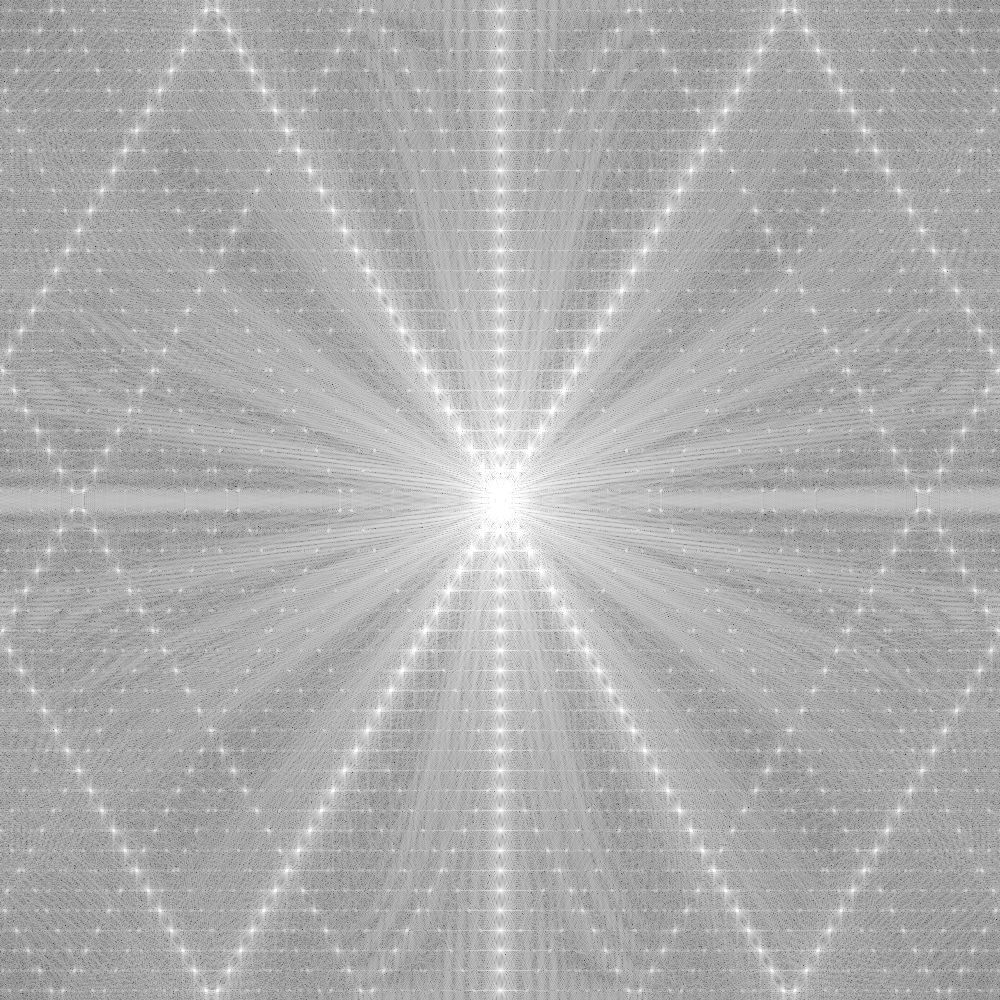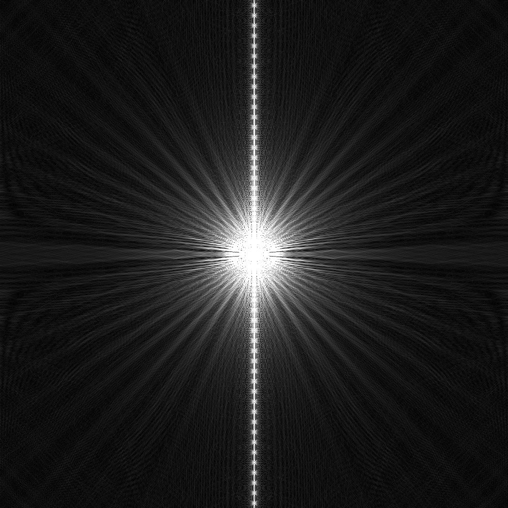 好怪呀,正常望远镜的成像不应该是一个艾里斑吗。我们来仔细看看这幅图像的含义,我们假设在图像中点建立一个xy坐标系,那么我们对照之前的傅里叶变换,这幅图里面应该包含孔径函数的各各频率分量的幅度,在这幅图上也就是亮度(与天文摄影时的图像类似,这张图我也进行了非线性拉伸,不然一片黑)。那么问题就在与这幅图上每个点的坐标有什么含义了。