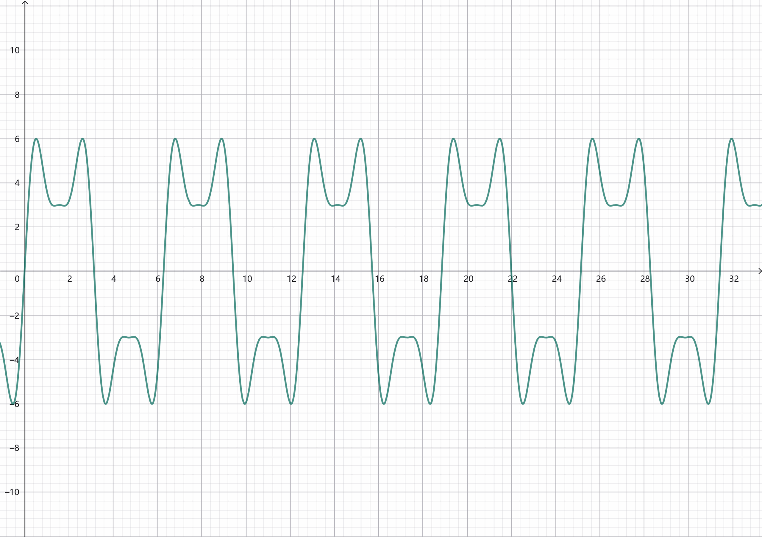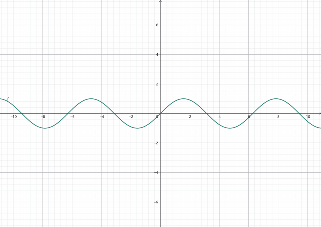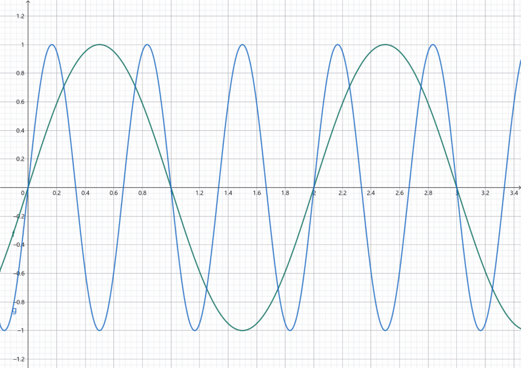 仔细观察这两个函数图像,尤其是它们两个的交点位置,你会发现这两个图像的交点同样会有周期性,假如我们采样得到的点就是这些交点,请问我们采样的原始信号是蓝色的信号还是绿色的信号呢?换一句话来说,假如我们向一个ADC中通入这两个信号,而ADC的采样间隔过大,那么它是分辨不了这两个信号的,如果我们对ADC采样得到的信号做傅里叶变换的话,尽管我们通入的信号是蓝色的,但是在频谱图上面我们会发现绿色函数图像对应的频率。