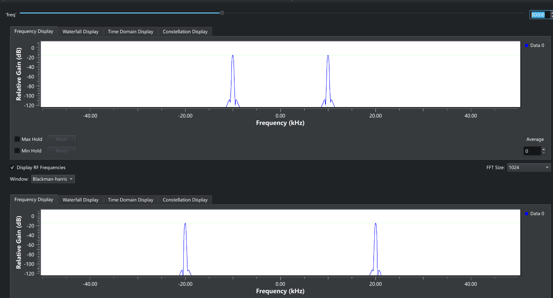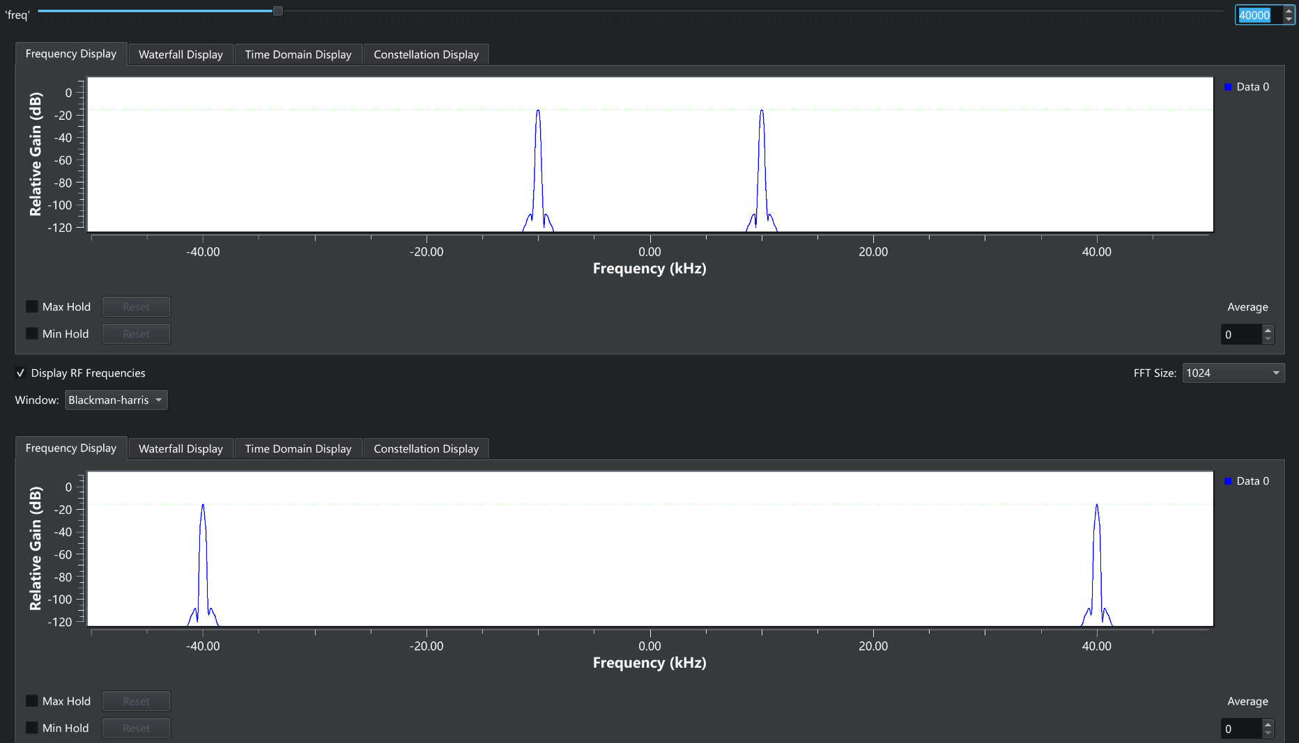 右上角就是我们输入的频率,下面两个窗口就是对应的频谱图,负数频率是傅里叶变换在复数域中形成的,我们不去管它就可以了上面那个窗口是10kHz的参考频率,下面的则是输入的频率,现在是40kHz, 可以看到现在的频谱图显示出来了正确的频率,现在我们来增大输入频率。
